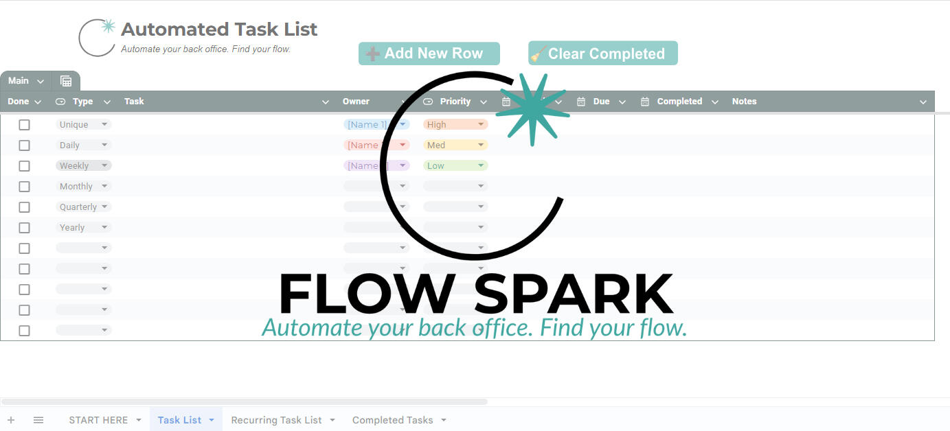 You need peace of mind. The kind that comes when your work handles itself.FlowSpark keeps your recurring tasks, deadlines, and priorities moving automatically, so your business stays on track even when life gets busy.Setup once. Run forever.